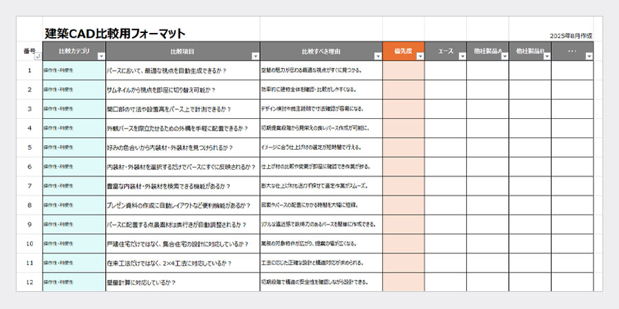 建築CADソフトを選定するときに比較すべき項目を、60項目リストアップしたエクセル表です。比較表フォーマットとしてご利用ください。各項目には比較すべき理由も記載しています。