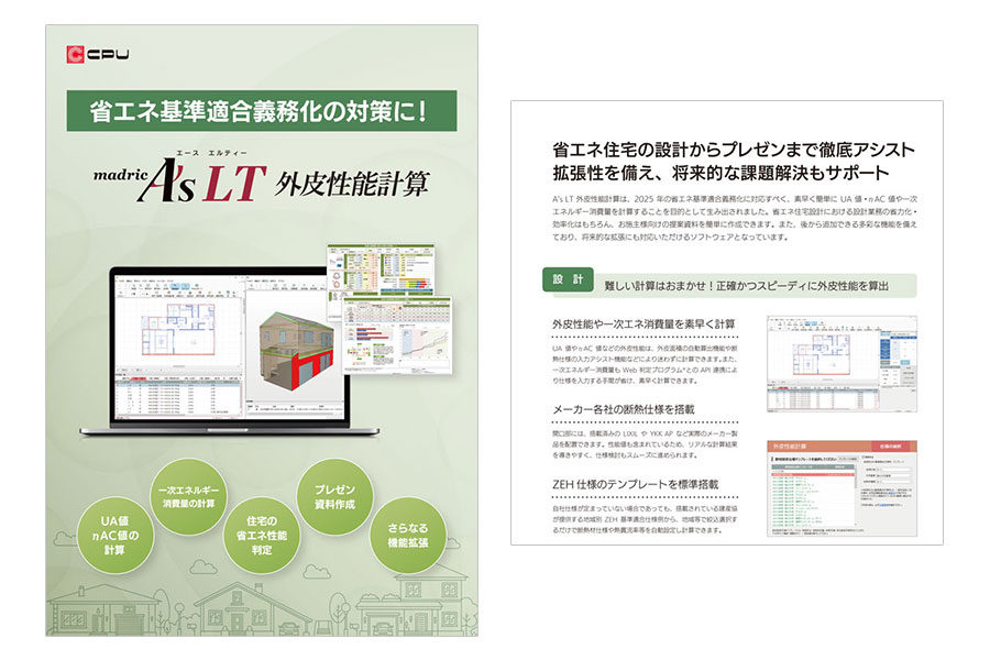 建築CAD「A's(エース)」の外皮性能計算機能に特化し、独立して稼働する製品です。UA値、ηAC値の計算、一次エネルギー消費量の計算、住宅の省エネ性能判定、プレゼン資料作成、更なる機能拡張について、ご紹介しています。