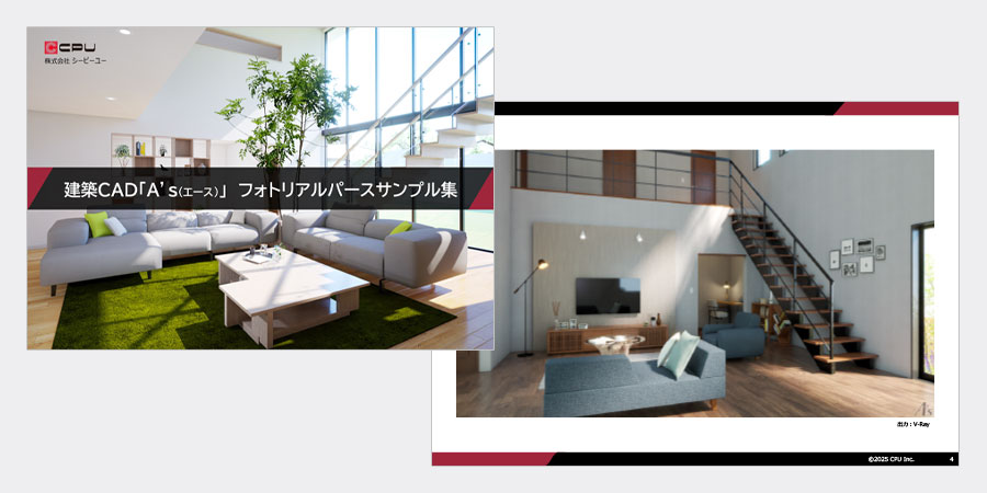 建築CAD「A's(エース)」のフォトリアルパースサンプル集です。住宅の内観・外観パース、スポーツジムやカフェといった非住宅パースを含め、80点のサンプルをご覧いただけます。