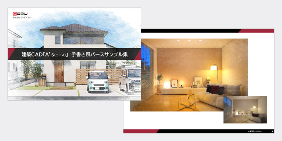 建築CAD「A's(エース)」の手書き風パースサンプル集です。スケッチ調や絵画調、色鉛筆風・水彩風など、手書きのあたたかみを再現したパースのサンプルを20点ご覧いただけます。