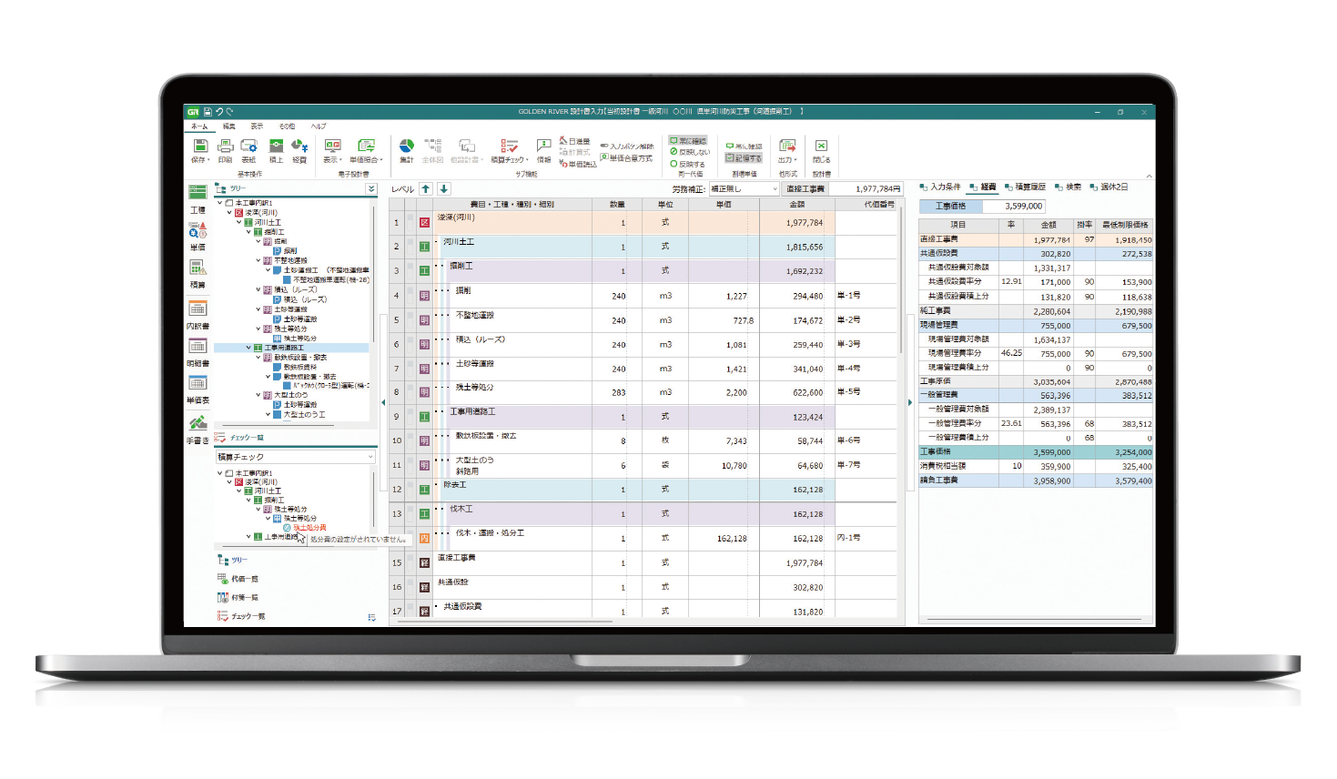 GOLDEN RIVER(ゴールデンリバー)は、公共工事の入札価格をスピーディーかつ正確に算出できる土木積算ソフトです。土木積算ソフトにおいて25年以上の開発・販売実績で培ったノウハウをもとに誕生しました。