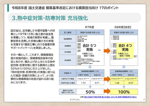 令和8年度の国土交通省 積算基準の改定内容のうち、積算業務を行う上で知っておきたいポイントをピックアップした資料です。積算ソフトの最新版を利用していれば、それほど心配はありませんが、最低限の情報を知っておくことで、積算業務の不安感を払拭できます。資料の巻末に、公開資料の提供元を集約したリンク集も収録しています。