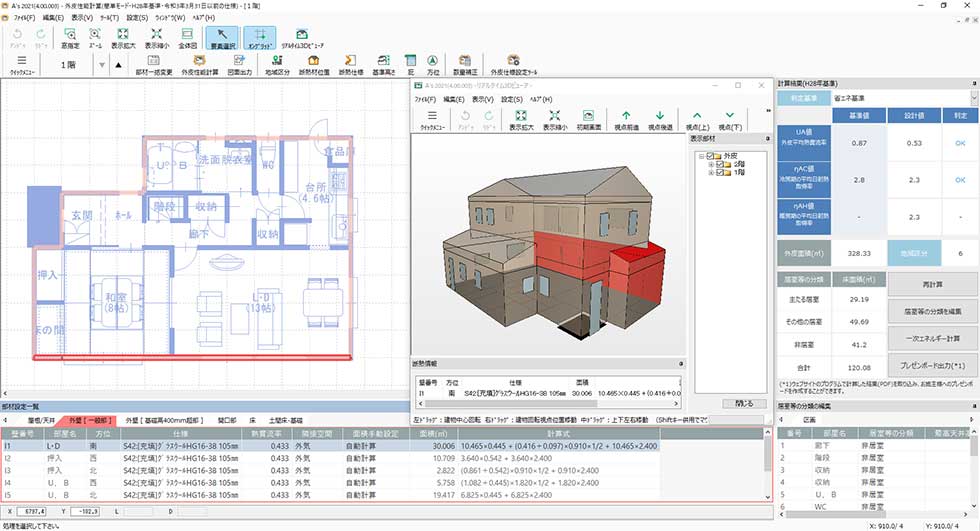 A’sの外皮性能計算オプションにてUA値・ηAC・ηAH値の算出ができます。